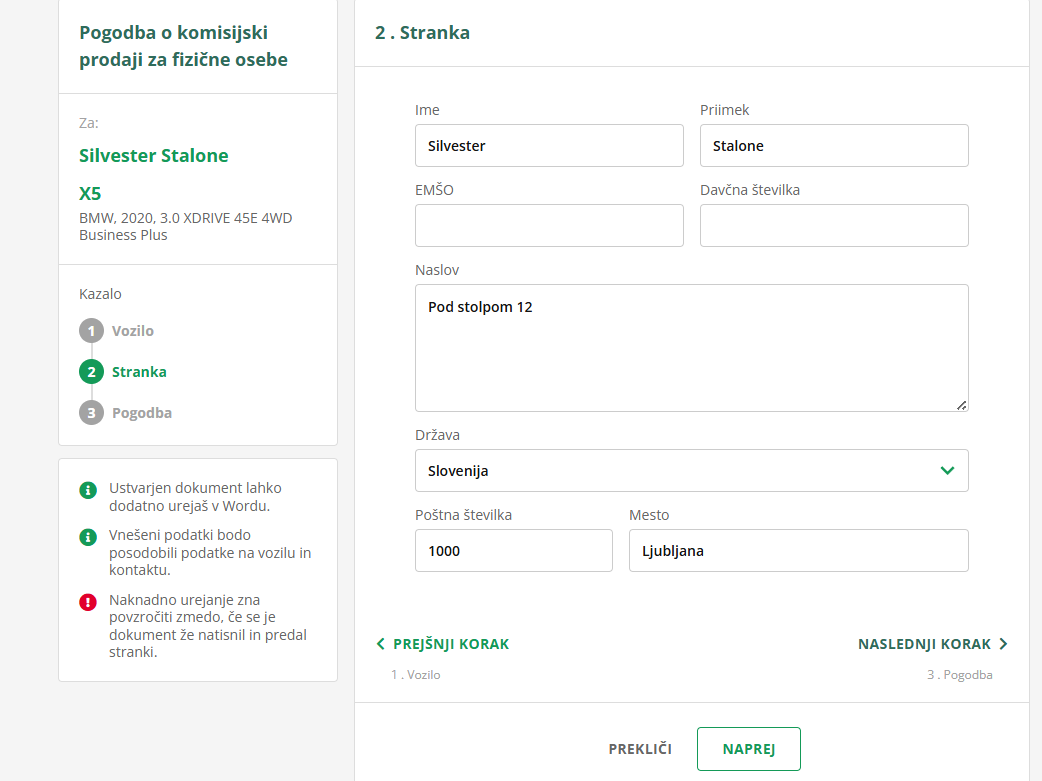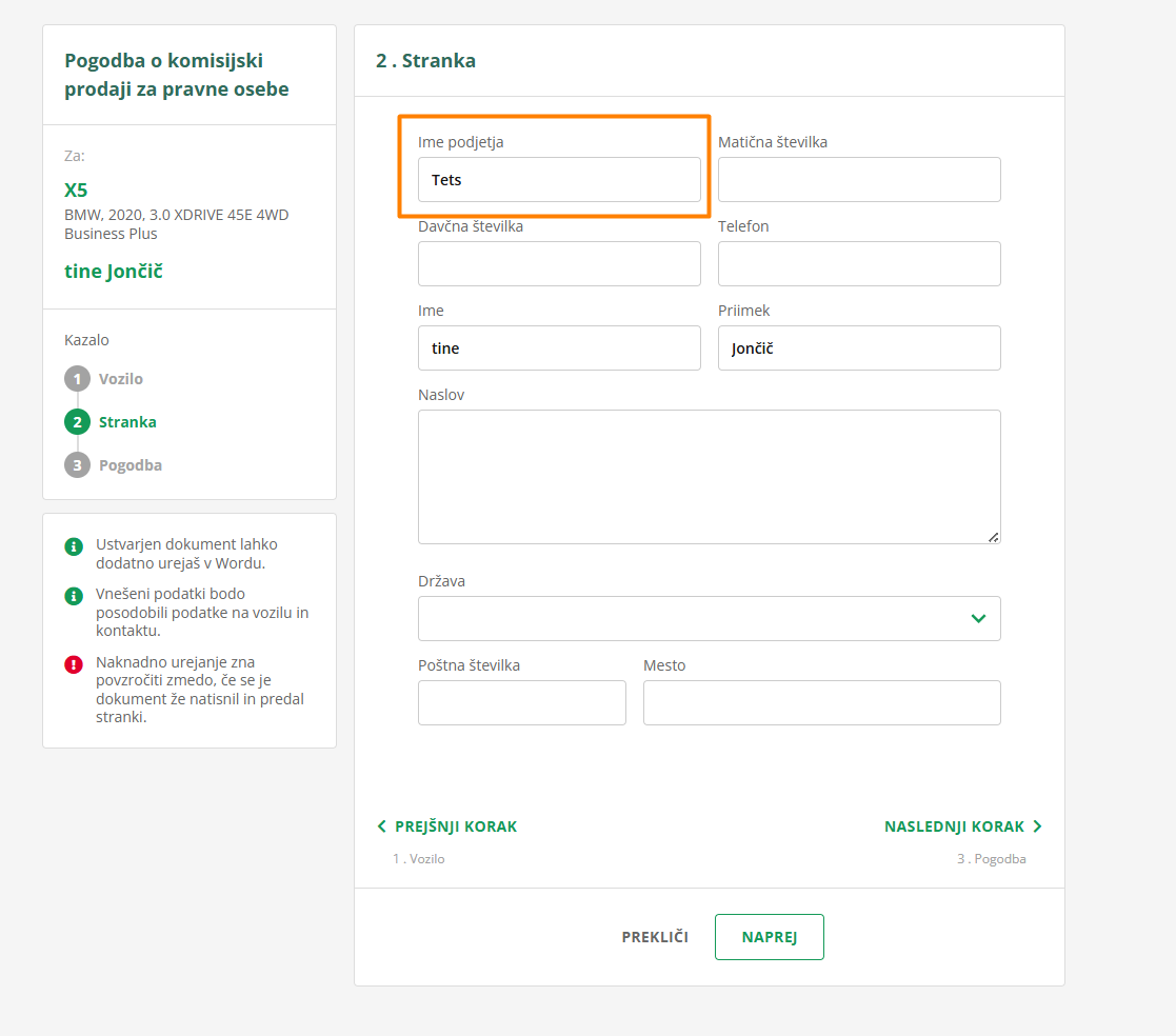 Drugi korak je popolnjen s podatki o stranki, katere kontakt si pripel na dokument.