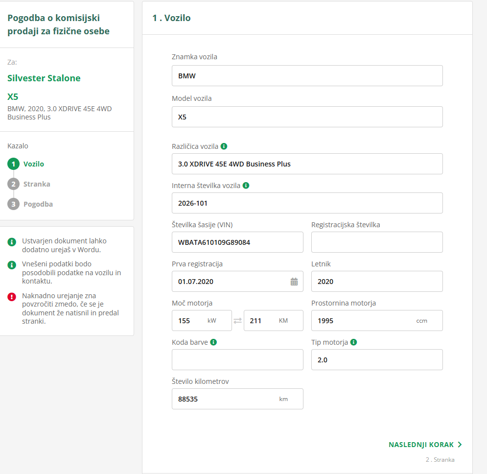 Nato se ti odpre obrazec, ki je na prvem koraku že popolnjen s podatki iz pripetega vozila.