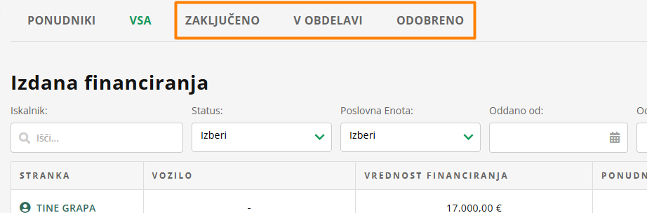 Gre za naslednje tri zavihke v zgornji vrstici modula Financiranje. Vsi trije zavihki so namenjeni temu, da kar najhitreje lahko dobiš vsa financiranja, ki so bila zaključena (status je tak, da je vloga na neki točki zaključena), tista financiranja, ki so trenutno v obdelavi, in tista, ki so bila odobrena.