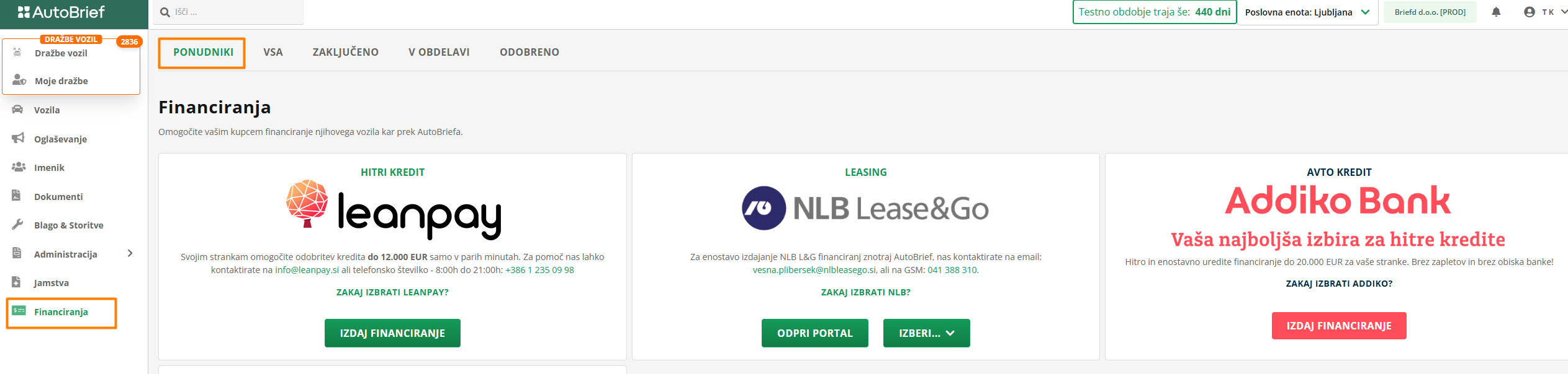 Če v glavnem meniju platforme klikneš na modul Financiranja se ti odpre zavihek Ponudniki.