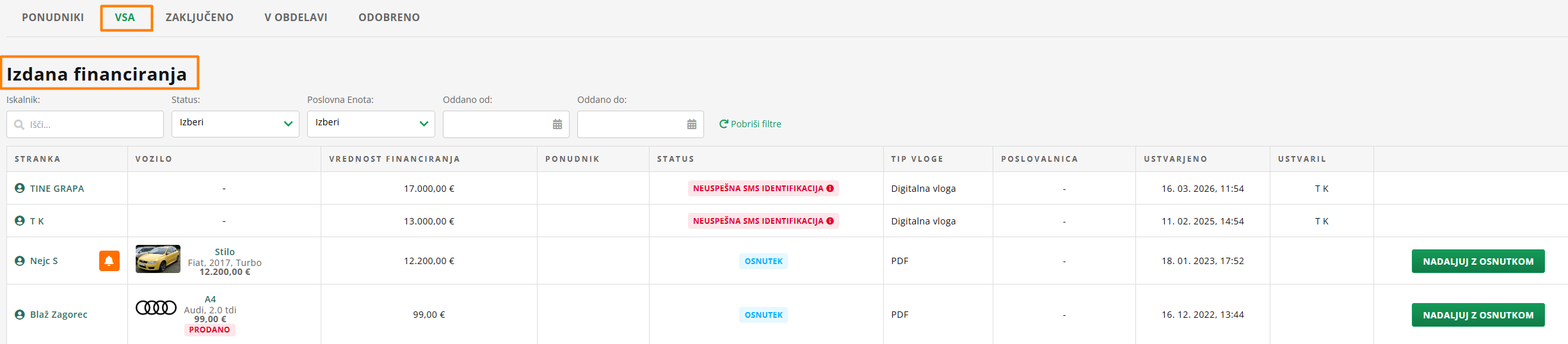 Iz tega zavihka lahko s klikom na gumb IZDAJ FINANCIRANJE pri vsakem ponudniku začneš proces izdaje financiranja.