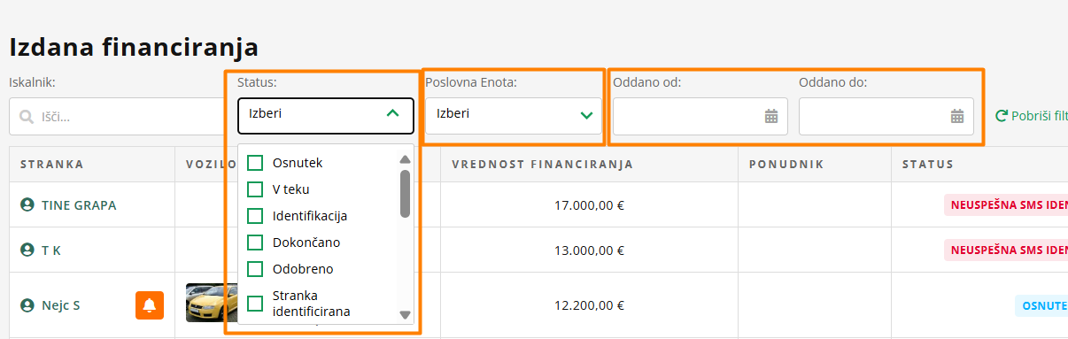 Pri vsakem imaš možnost financiranje poiskati tudi po vozilu, kontaktu ali vrednosti financiranja. Enega izmed teh podatkov vpiši v iskalnik in hitro boš našel iskano financiranje.