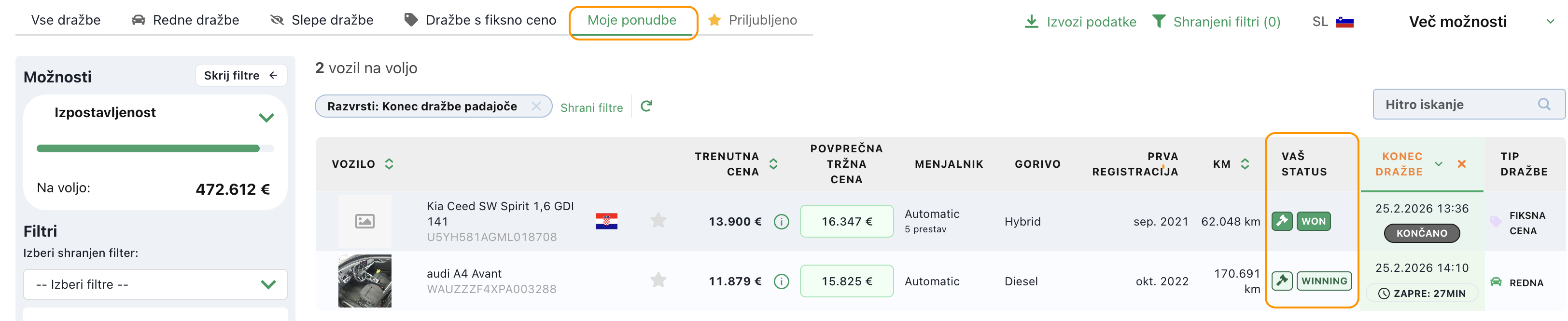 - Status WINNING pomeni, da imaš trenutno najvišjo ponudbo na vozilu.