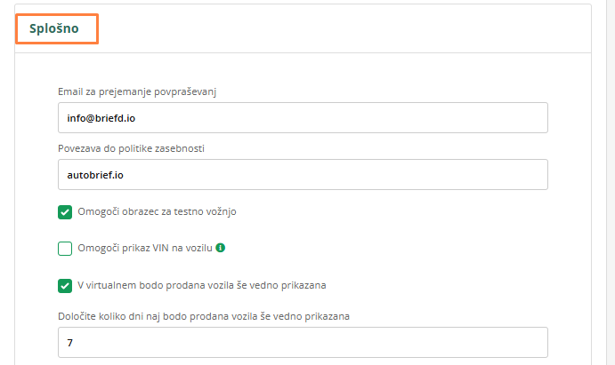- Število dni, ko bodo prodana vozila še prikazana - lahko dodaš številko, koliko časa so prodana vozila na virtualnem salonu še prikazana. Po označenih dnevih, se vozila ne bodo več prikazovala.