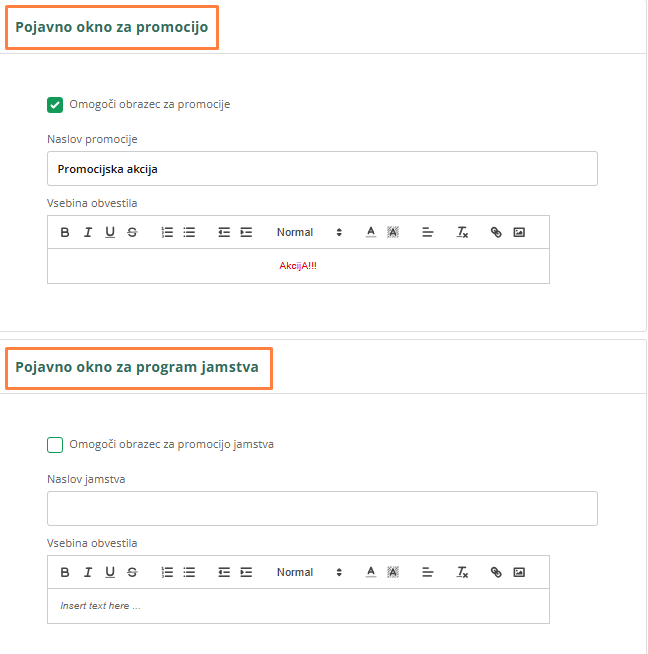 - Promocijsko okno (npr. "Promocijska akcija" / "Akcija!!!") - predvsem je primerno uporabiti to možnost, če si želiš, da obiskovalci tvoje strani zaradi promocijske akcije oddajo svoje podatke, ki jih lahko s pridom uporabiš v prodajnem procesu. Bolj kot bo tvoja ponudba zanimiva (npr: zastonj zimske gume, zastonj vinjeta ...) , več podatkov boš dobil.