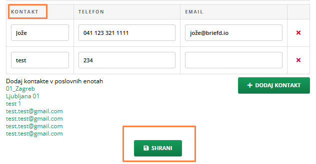 Uporabnik lahko doda kontaktne osebe (ime, telefon, email) in jih poveže s poslovnimi enotami. Če imaš torej več salonov, lahko za vsak salon dodaš kontakt, ki bo na voljo obiskovalcem tvojega virtualnega salona. Ti kontakti se nato prikazujejo v salonu, glede na poslovno enoto.