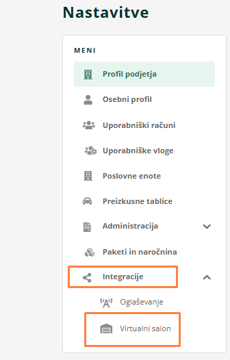 Nastavitve Virtualnega salona so sedaj dostopne na nivoju uporabniškega računa. Vsak uporabnik lahko samostojno ureja celoten izgled, delovanje in logiko objav svojega virtualnega salona. Do nastavitev dostopaš prek: Nastavitve > Integracije > Virtualni salon