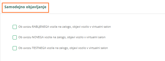 Sam izberi, katere kategorije želiš imeti avtomatsko objavljene (te lahko odkljukaš. Če bodo polja prazna, nobeno izmed vozil ne bo avtomatsko objavljeno.