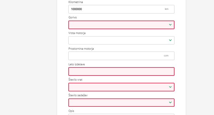 Pomembno: V kolikor ne boš izpolnil zahtevanega polja, oglasa ne boš mogel objaviti. Na vse to te opozarja rdeča barva in napis - polja niso pravilno izpolnjena.