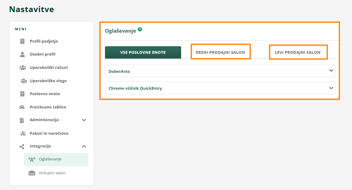 Doberavto.si in vtičnik Quick Entry je mogoče nastavljati samo za vse poslovne enote skupaj, medtem ko za Njuškalo, Shopaj, Bolha in Index, lahko nastaviš za vsako poslovno enoto posebej, če pri njej dodaš smostojen račun za oglaševanje.