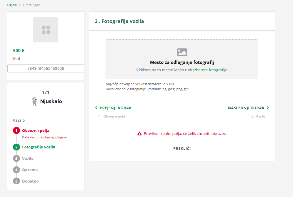 V drugem koraku lahko dodaš fotografije vozila, ki ga želiš oglaševati. Fotografije niso nujne, a zelo pripomorejo k hitri prodaji vozila. Klikni NADALJUJ.