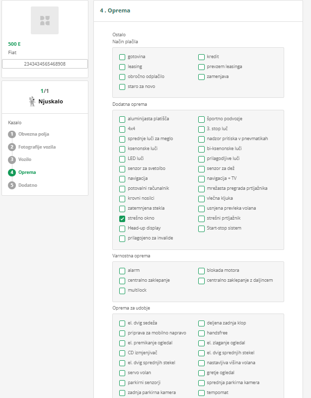 V četrtem koraku lahko vpišeš še več podatkov o opremi vozila, ki jih bodo videli potencialni kupci. Podatki niso obvezni.