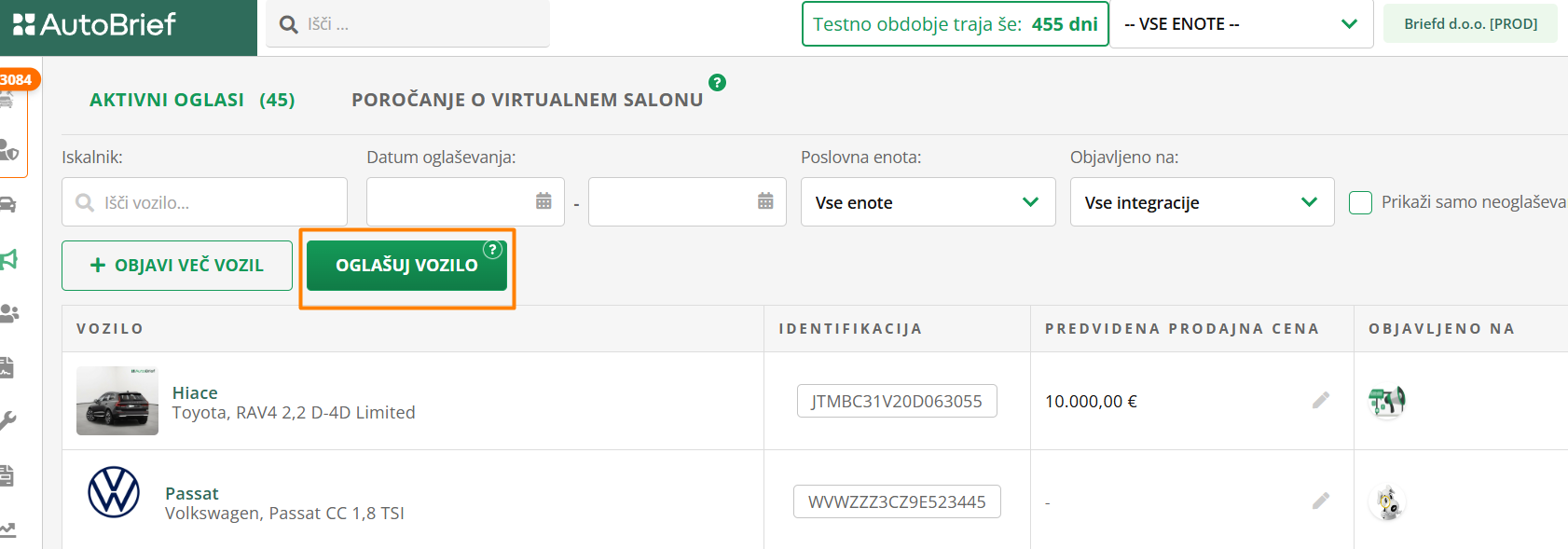 - V zgornjem desnem kotu modula izberi gumb OGLAŠUJ VOZILO.
