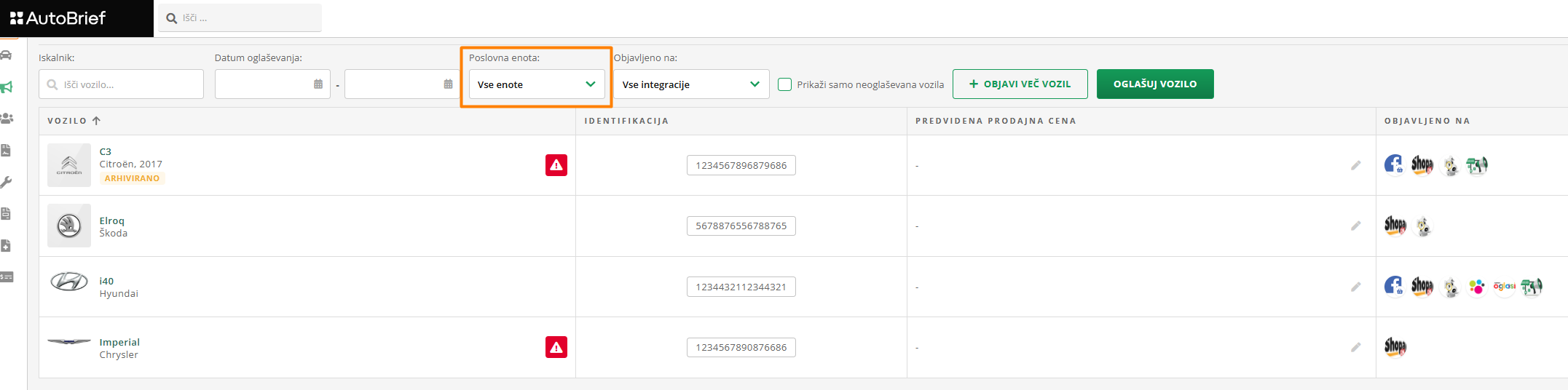 Katera vozila imaš oglaševana, na kateri poslovni enoti, je mogoče zelo enostavno spremljati v modulu Oglaševanje. Med filtri v zgornji vrstici je mogoče enostavno izbirati med pogledom vsake posamezne poslovne enote, ali vseh skupaj.