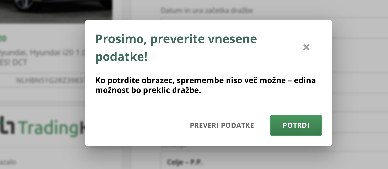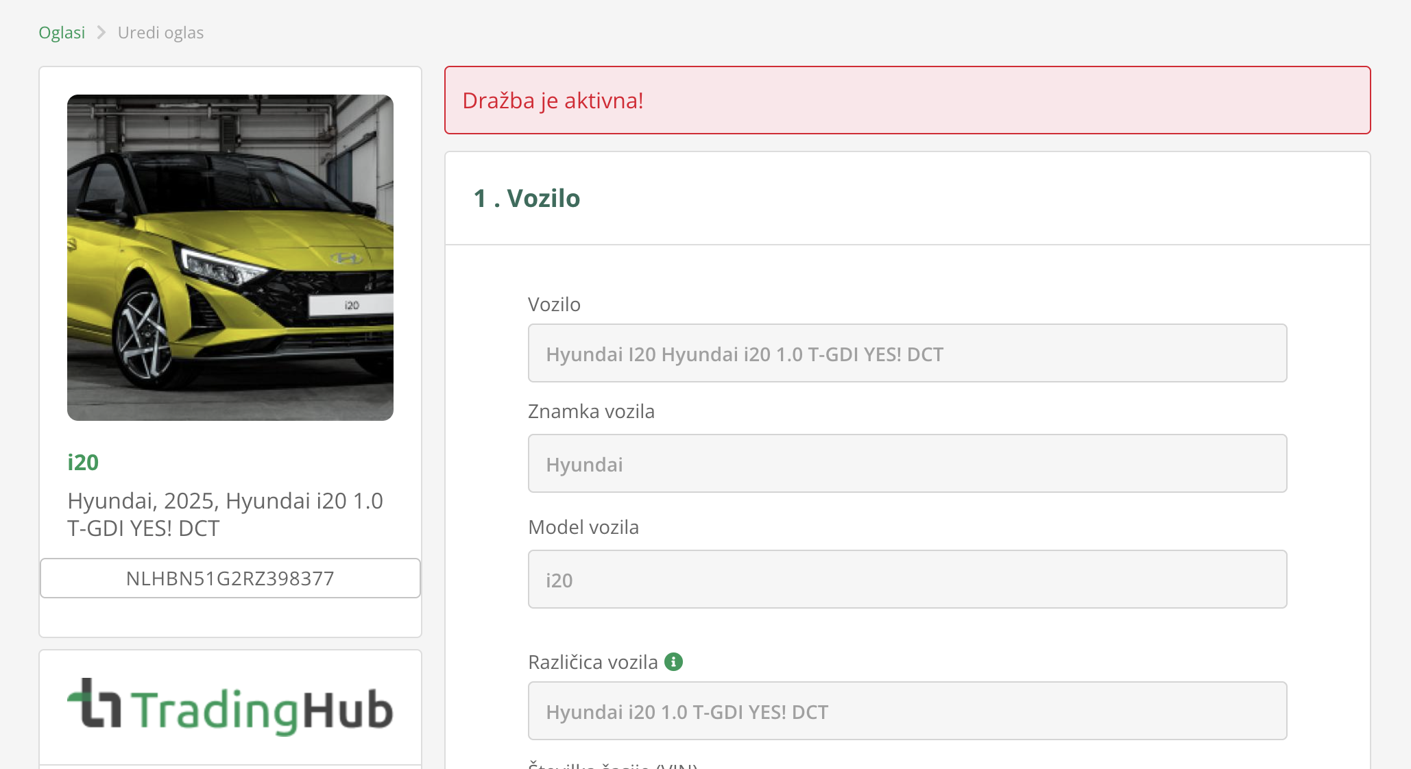Če med trajanjem dražbe poskušaš vozilo ponovno objaviti ali zamenjati tip dražbe, te bo sistem opozoril, da je objava že aktivna. Objava v več dražbah hkrati ni dovoljena.