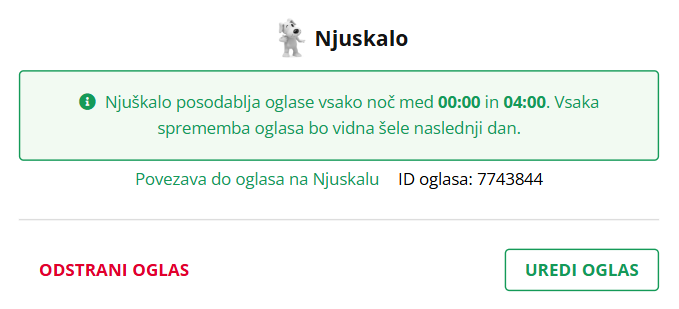 Pomembno: Njuškalo posodablja oglase vsako noč med 00:00 in 04:00. Vsaka sprememba oglasa bo vidna šele naslednji dan.