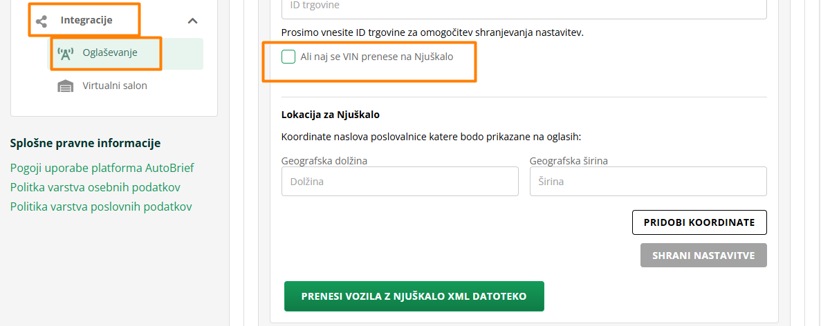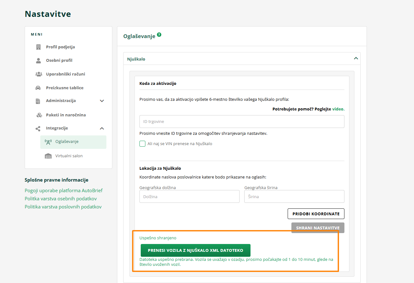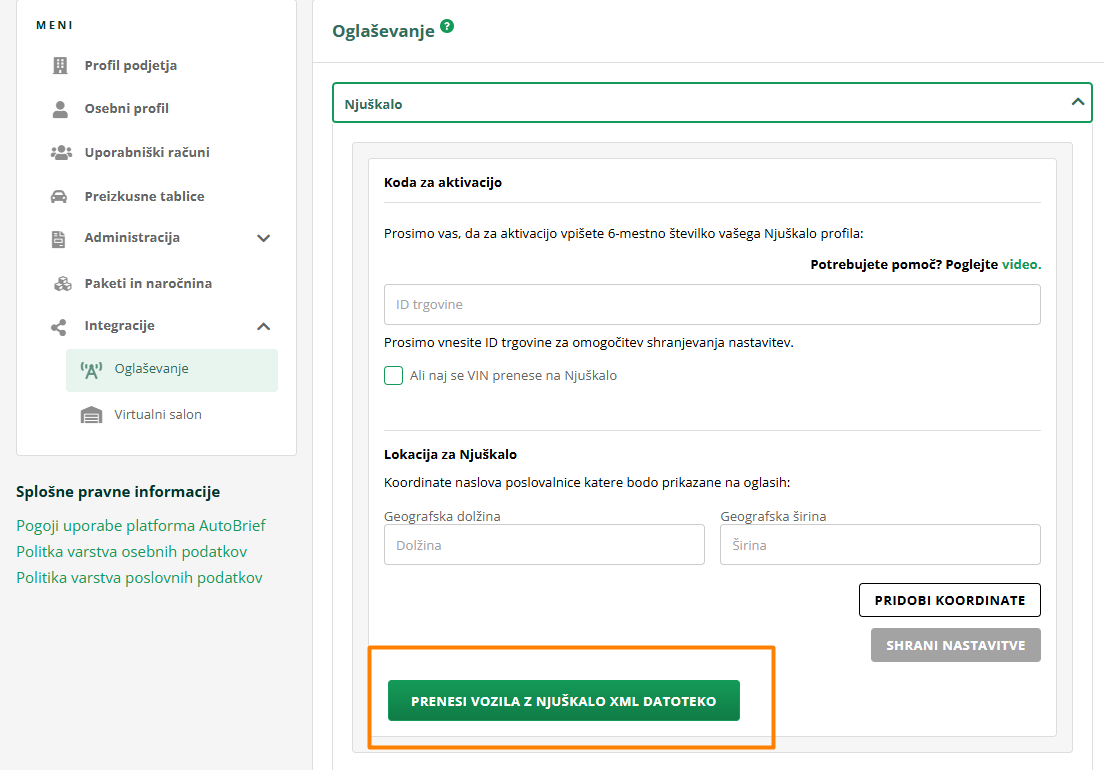 - Tam imaš gumb Prenesi vozila z Njuškalo XML datoteko, kamor omenjeno datoteko naložiš.