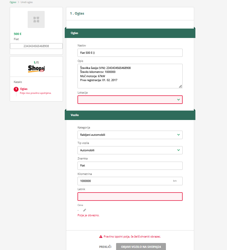 - S klikom nanj se bo odprl obrazec, ki od tebe zahteva, da poleg že vnesenih podatkov, vpisati še lokacijo, kjer se vozilo nahaja, letnik vozila ter ceno vozila. Ti trije podatki so obvezni!
