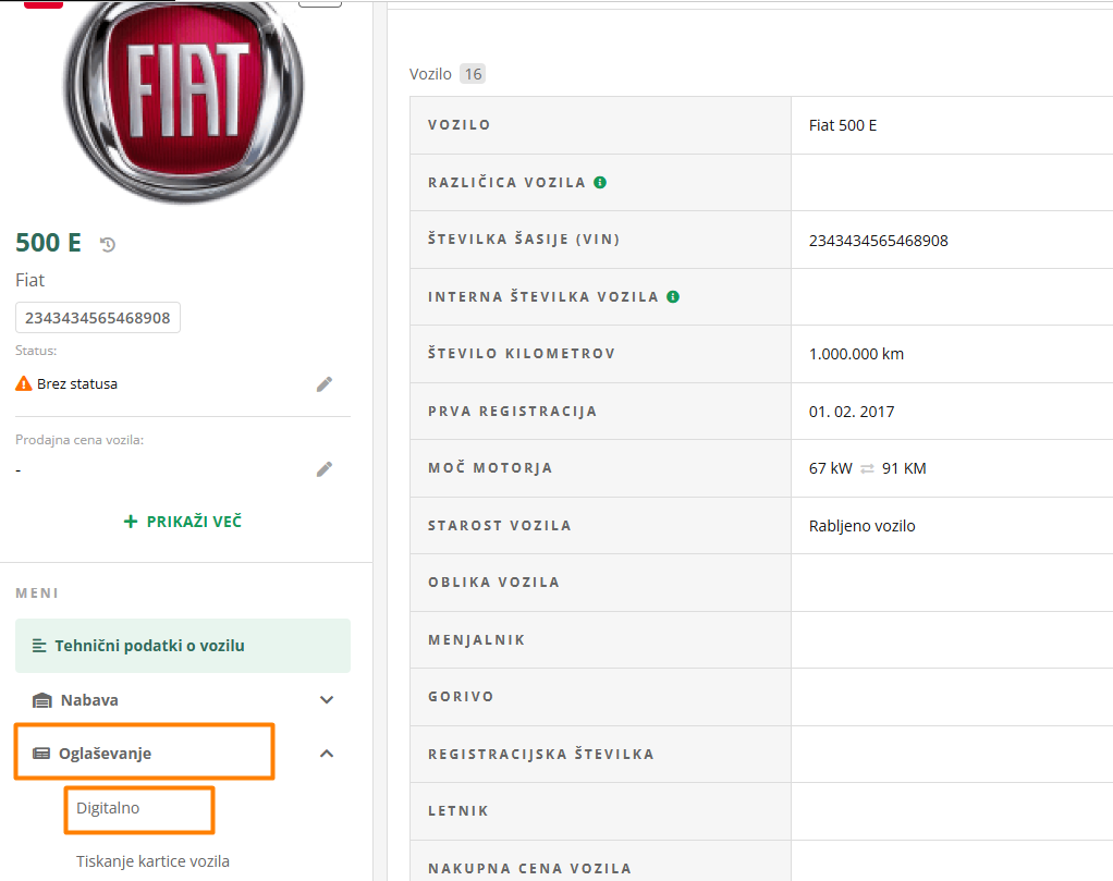 - Klikni na VOZILA in izberi vozilo, ki ga želiš oglaševati.