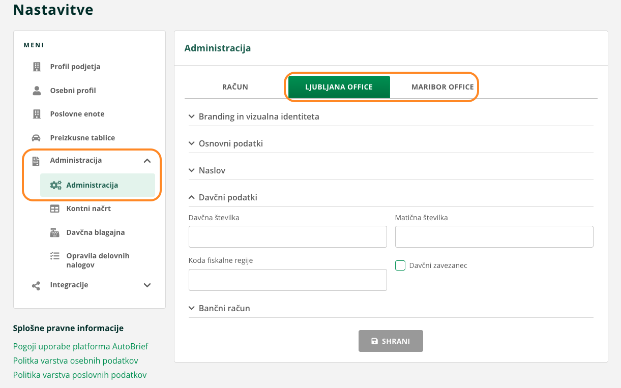 Znotraj nastavitev -> Administracija, lahko urejaš specifike vsake poslovne enote. Ob kliku na izbrano poslovno enoto lahko: