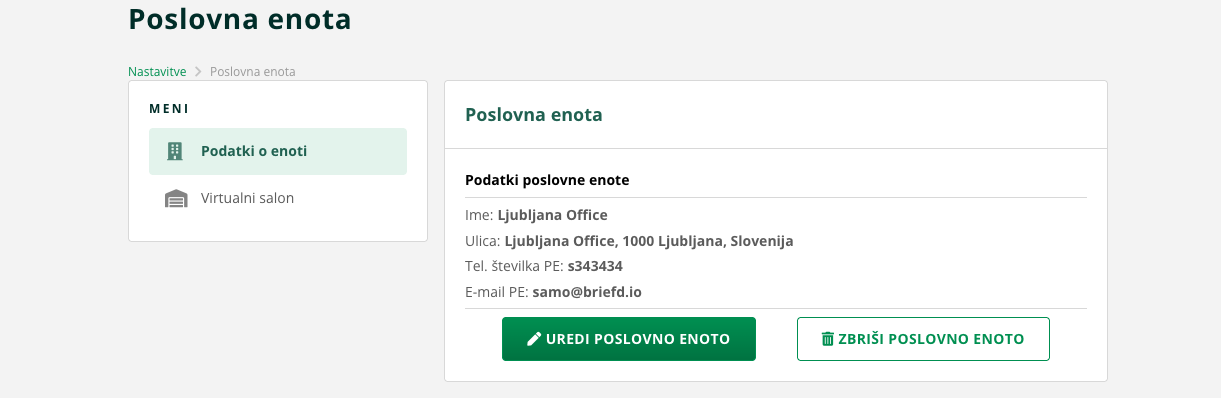Tako kot ustvarjanje, lahko poslovne enote urejaš znotraj nastavitev profila. S klikom na enoto lahko urediš podatke poslovne enote, ali le-to izbrišeš.