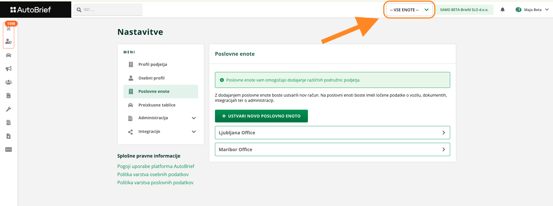 Poslovno enoto lahko izbereš v zgornjem delu platforme, kjer je prikazana trenutna aktivna enota. Izbira "VSE ENOTE" omogoča vodenje poslovanja povprek vseh enot, z izbiro specifične enote, pa je vidna le zaloga vozil specifične enote.