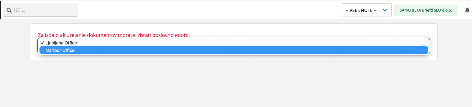 Če uporabljaš več poslovnih enot, moraš pri izdaji dokumentov vedno preveriti, za katero enoto dokument izdajaš. Če dokument izdaš pod napačno enoto, se lahko na dokumentu prikažejo napačni podatki o podjetju ali lokaciji.