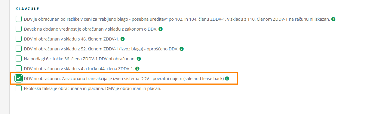 - Na računu izberi klavzulo "DDV ni obračunan. Zaračunana transakcija je izven sistema DDV - povratni najem (sale and lease back)".