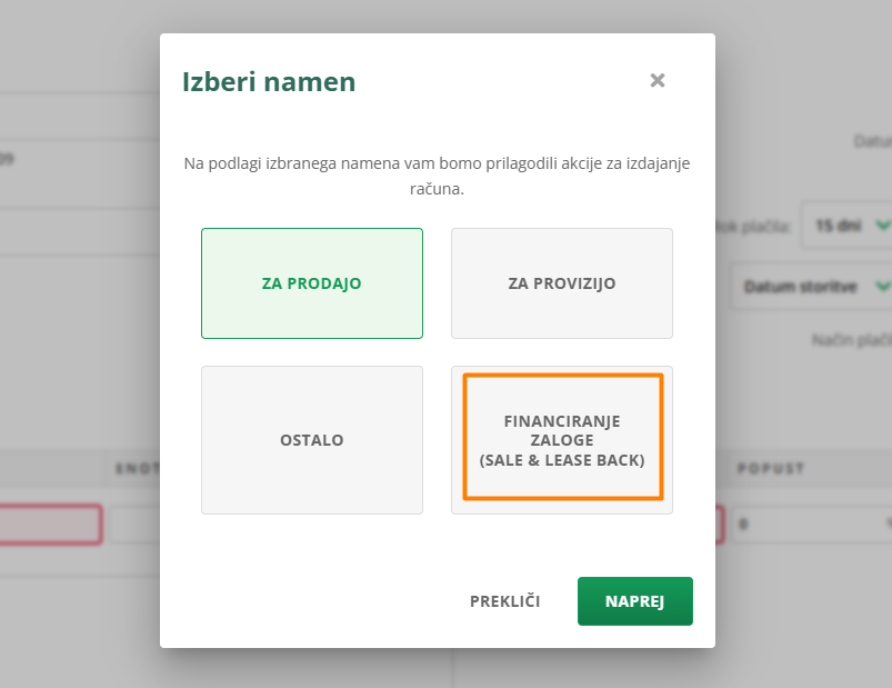 - Pri izdaji računa izberi namen "Financiranje zaloge Sale & Lease back".