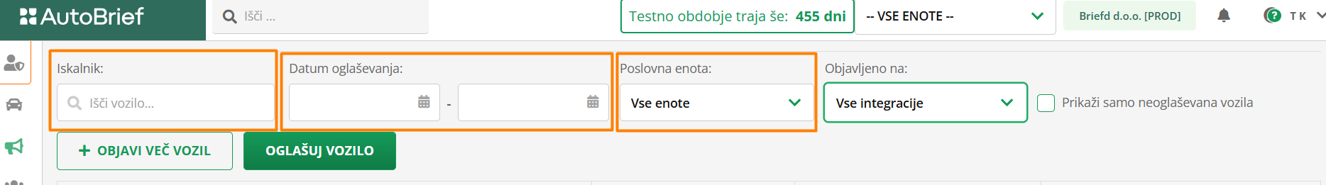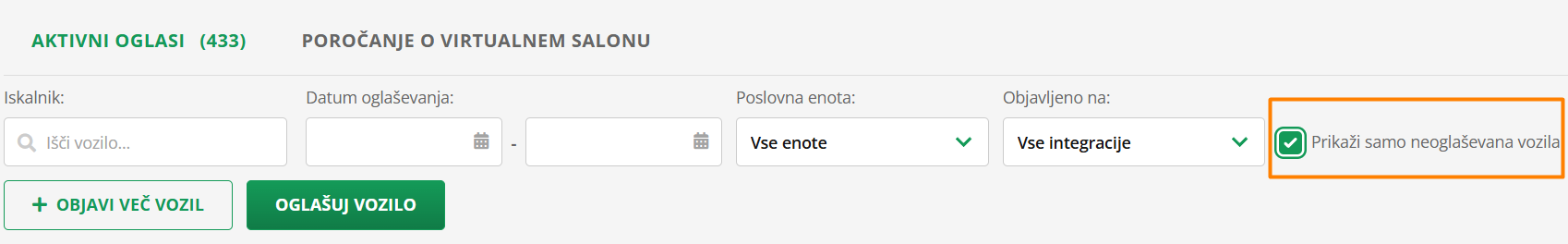 Najlažji način, na katerega najdeš vsa neoglaševana vozila, je klik na okence v zgornjem meniju z imenom Prikaži samo neoglaševana vozila.