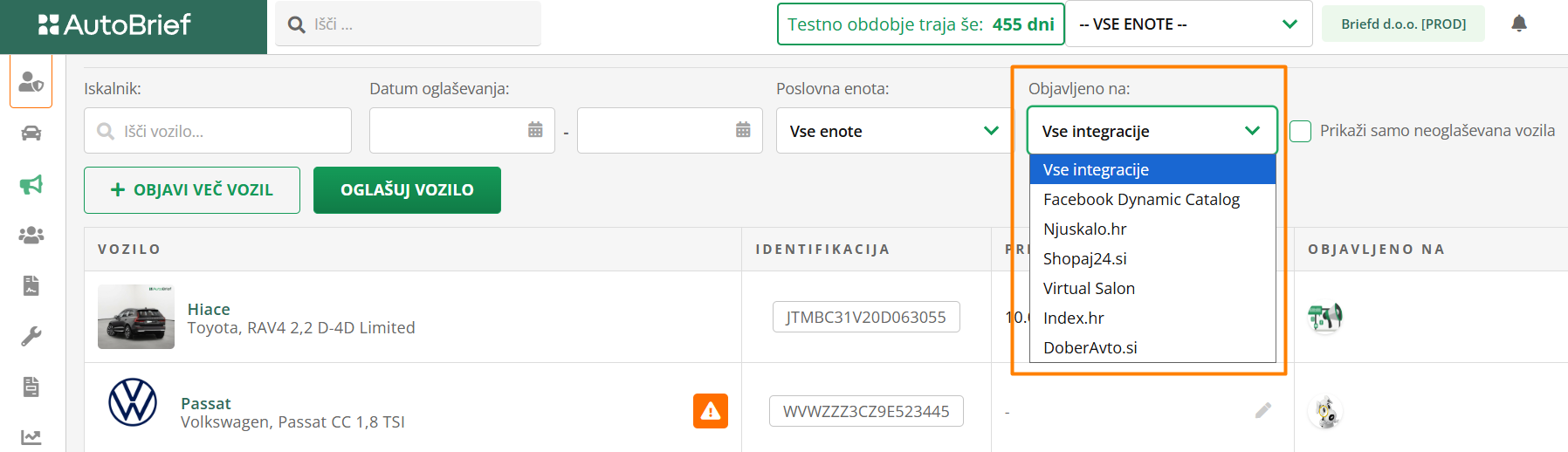 2. Poleg vsakega vozila vidiš tudi, kje je objavljen. S klikom na posamezno ikono ponudnika oglaševanja, se ti takoj odpre obrazec oglasa, ki si ga objavil, tako da ga lahko takoj urediš.
