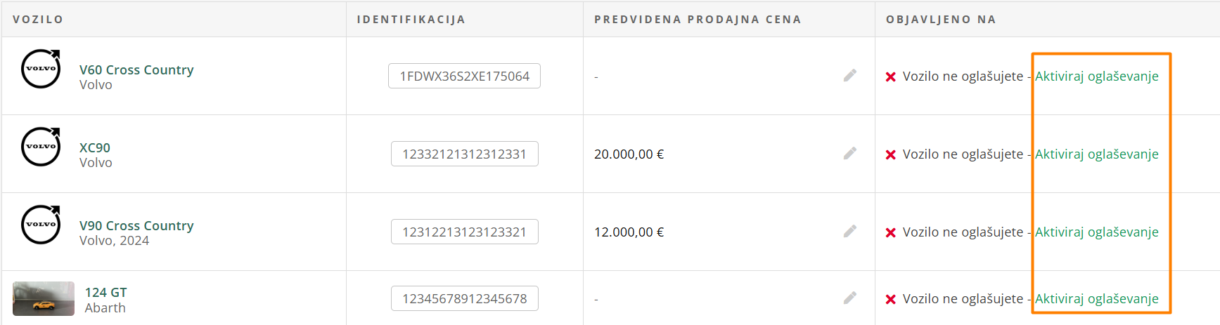 Sistem ti prikaže samo vozila, ki še nimajo nobenega oglasa in ti v desnem stolpcu ponudi možnost, da jih z gumbom Aktiviraj oglaševanje, takoj oglašuješ.