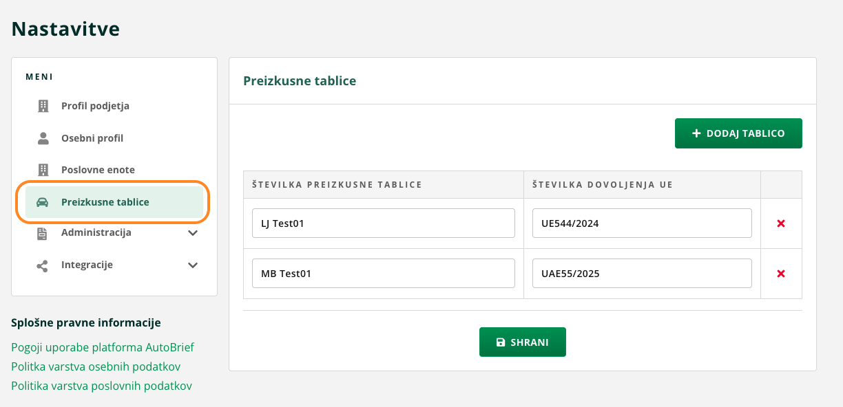 V razdelku Nastavitve → Preizkusne tablice lahko vneseš številke preizkusnih tablic in ustrezna dovoljenja UE.