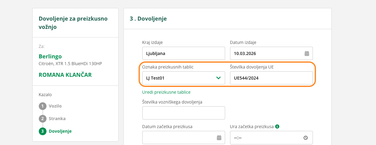 Pri izdaji dokumenta Dovoljenje za preizkusno vožnjo lahko izbereš eno izmed shranjenih tablic. Sistem bo nato samodejno prenesel podatke v dokument, kar omogoča hitrejše in bolj pregledno izpolnjevanje.