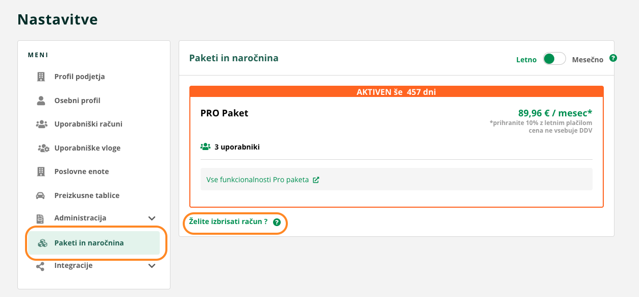 Namesto popolnega izbrisa priporočamo prehod na brezplačni MINI paket.