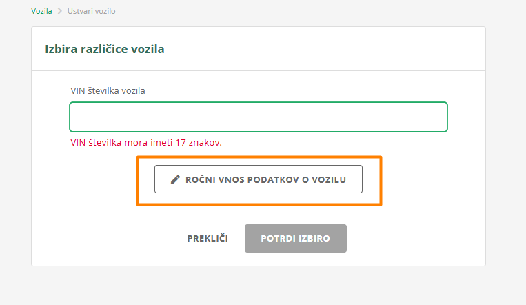 Odprla se ti bo stran, kjer klikni na gumb ROČNI VNOS PODATKOV O VOZILU.