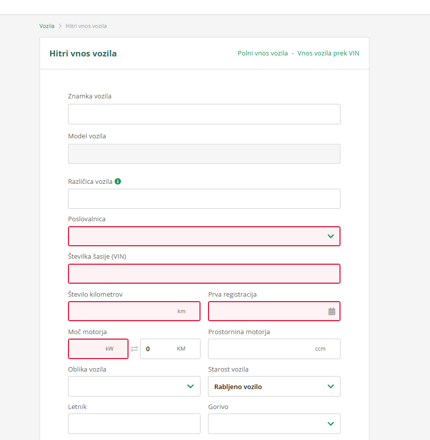 Poleg hitrega vnosa vozila imaš možnost tudi klika zgoraj desno na Polni vnos vozila, ki je identičen kot, če bi vnašal vozilo preko VIN številke. Vedeti moraš, da bo v primeru ročnega vnosa obrazec za polni vnos vozila popolnoma prazen.