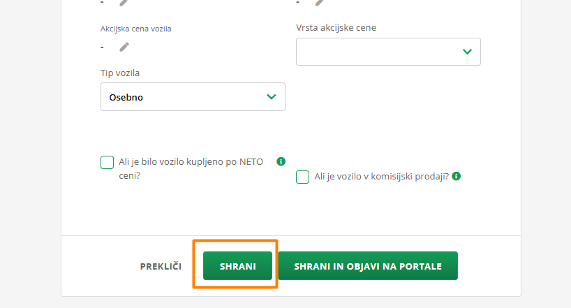 Ne glede na to, za kakšen ročni vnos (Hitri ali Polni) se boš odločil, je število nujnih podatkov, da sistem shrani vozilo, enako. Na koncu postopka moraš klikniti na SHRANI VOZILO.