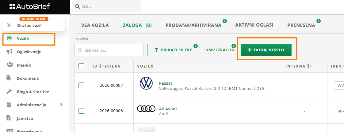 Dodajanje vozila v AutoBrief je preprosto. Na tem mestu bomo pogledali ročni vnos vozila na zalogo. Kot lažji način sicer predlagamo vnos vozila preko VIN številke, ki je hitrejši, a ima baza podatkov, ki jo dobivamo od zunanjega vira, omejeno bazo podatkov.
