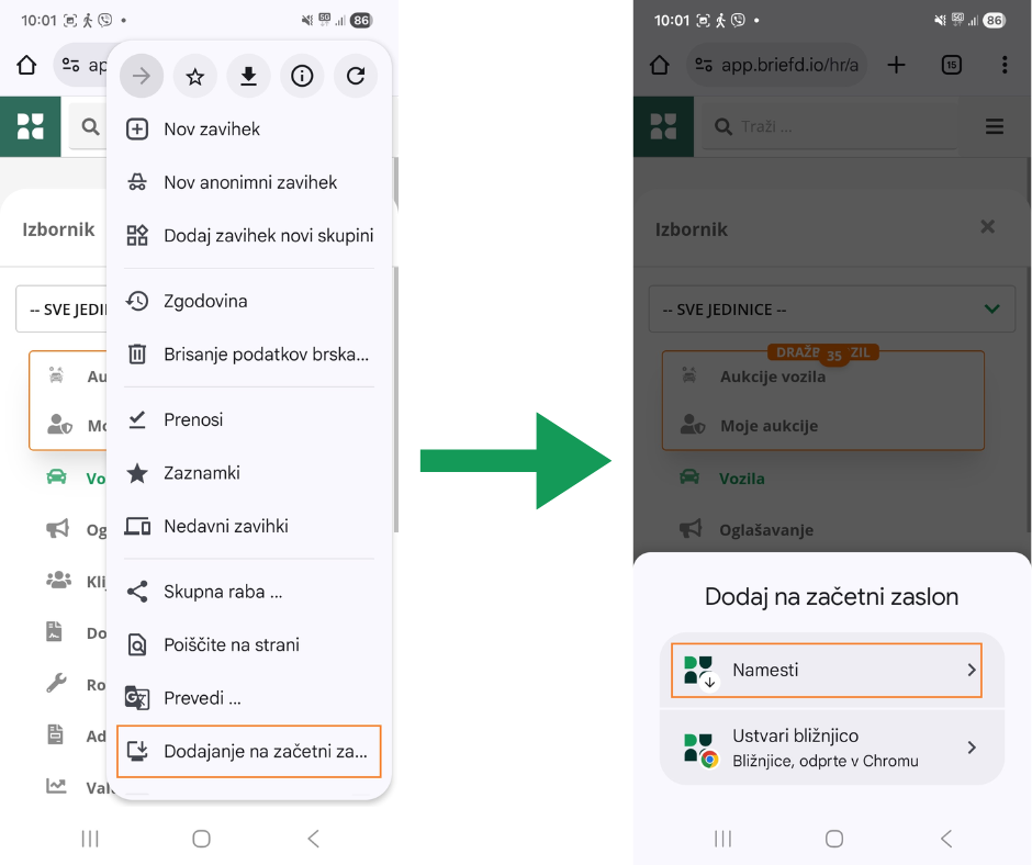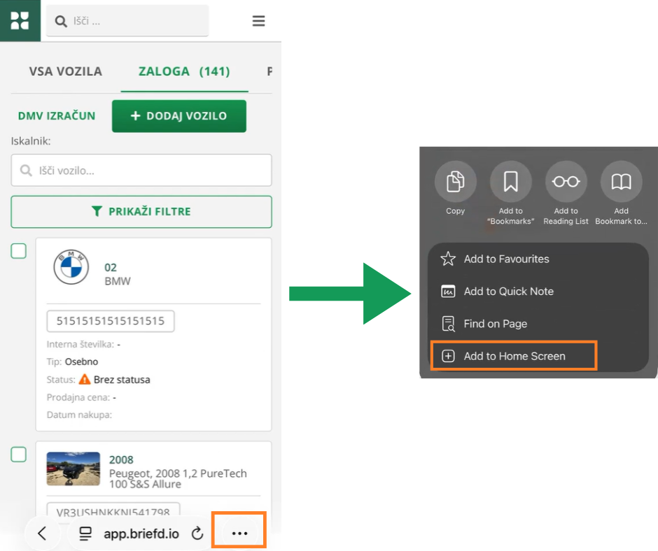 AutoBrief lahko kot spletno aplikacijo namestiš na začetni zaslon telefona ali računalnika.