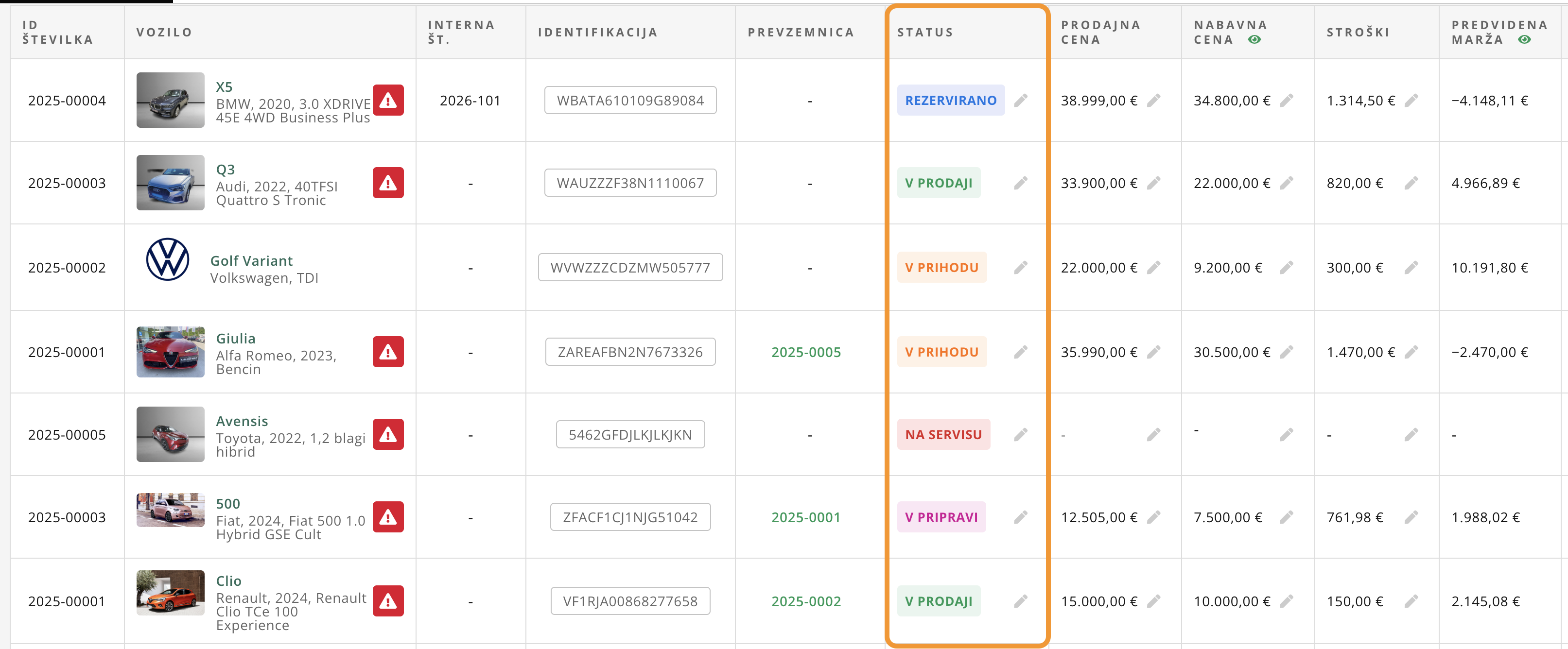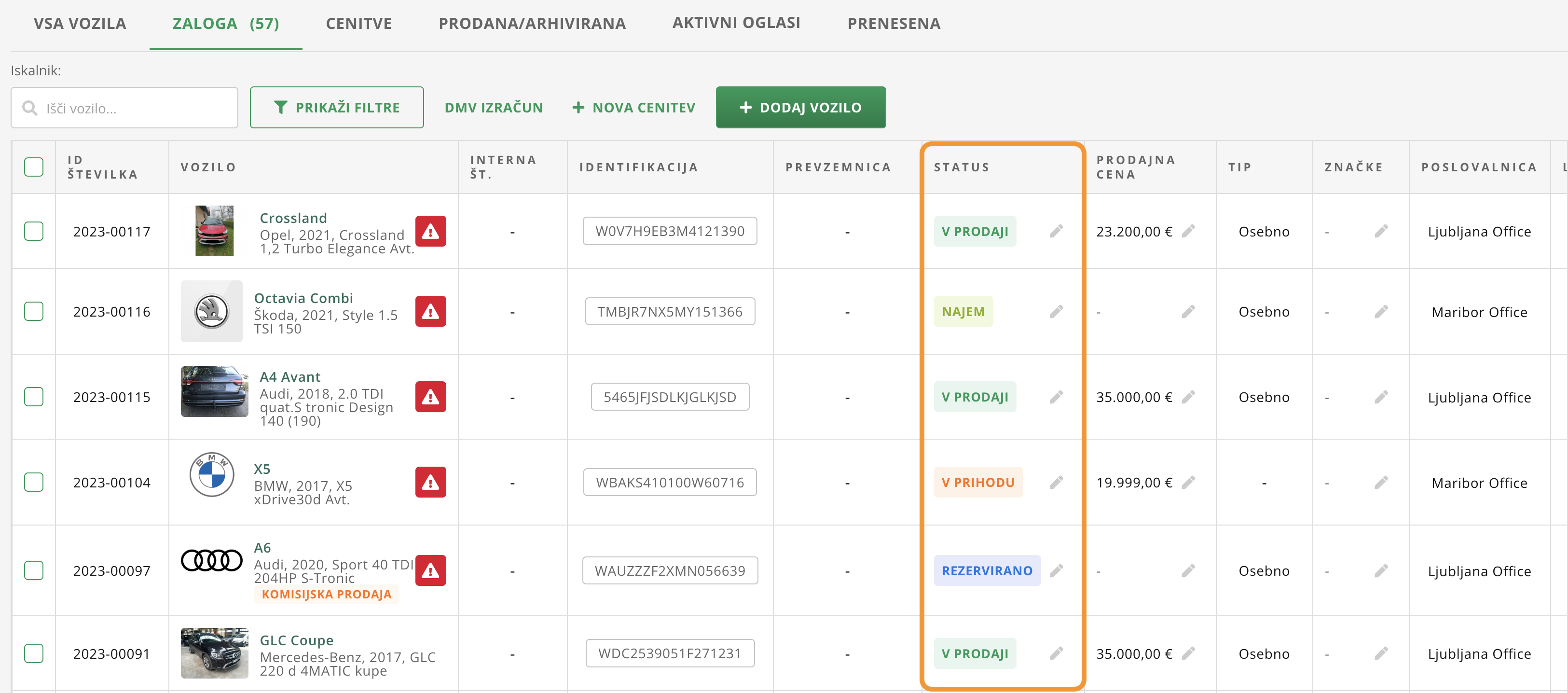 - ARHIVIRANO: status se uporablja za vozila, ki jih želiš odstraniti iz aktivne zaloge.