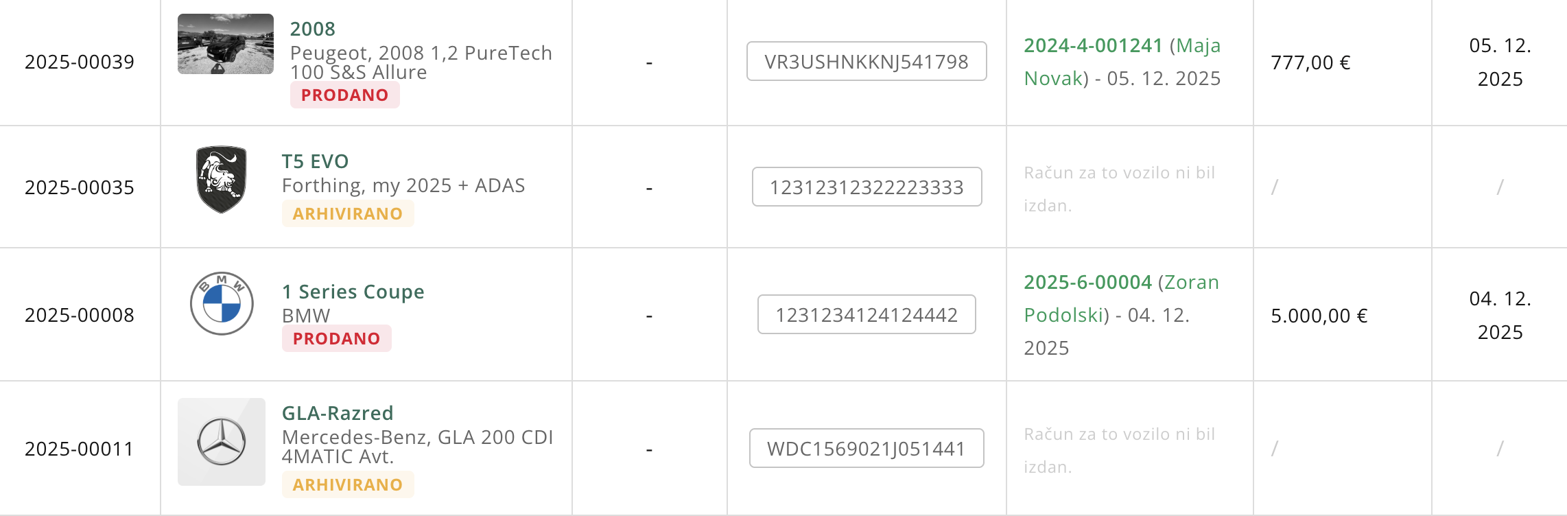 - PRODANO: status označuje vozila, ki so bila uspešno prodana. Ko vozilo prodaš in izdaš račun, se status samodejno spremeni v Prodano.
