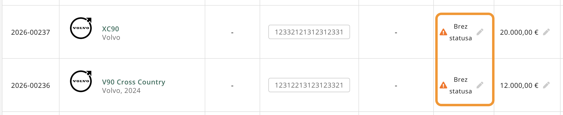 Vozila, ki jih dodaš na zalogo so na začetku brez podeljenega statusa. Status se jim kasneje lahko avtomatsko spremeni, v kolikor vozilo prodaš, ali ga pošlješ na drugo lokacijo.