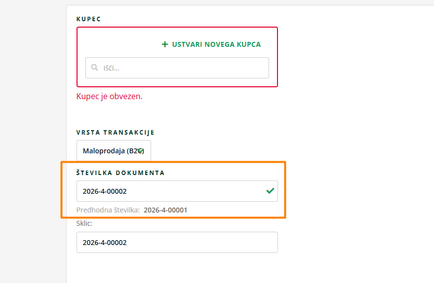 Ko izbereš poslovno enoto, sistem vzame zadnjo izdano številko dokumenta za to poslovno enoto in jo poveča za 1.