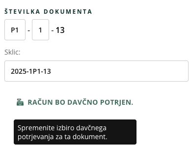 Če imaš vklopljeno davčno potrjevanje računov, potem je zelo pomembno, da veš, da se davčno potrjeni računi številčijo ločeno od tistih računov, ki niso davčno potrjeni. Več o tem si preberi tukaj.