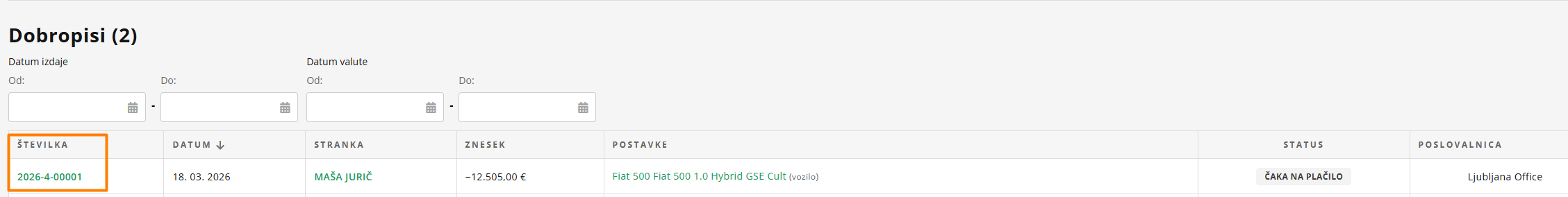 Primer: Če storniraš račun 2026-4-00001, potem bo naslednji račun, ki ga boš izdal 2026-4-00002. To pa zato, ker gre številka 2026-4-00001 na dobropis. Zato bo sistem avtomatsko nadaljeval z računom 2026-4-00002.