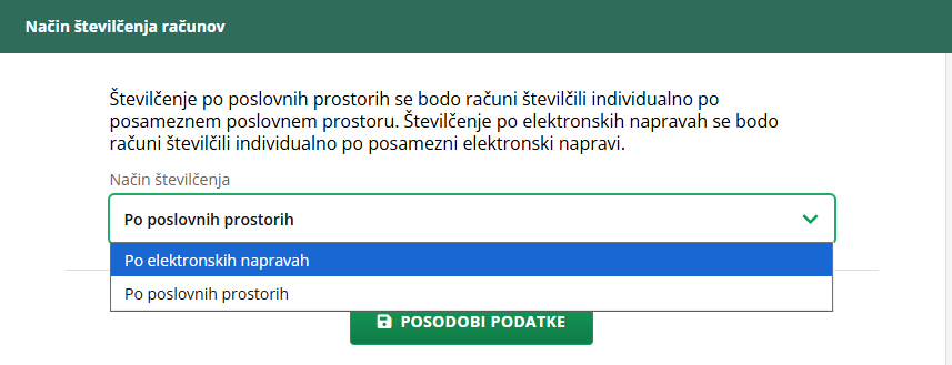 Za davčno potrjene račune je mogoče tudi izbrati način številčenja. Možnosti so: po elektronskih napravah ali po poslovnih prostorih.
