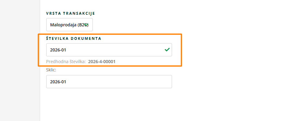 Primer: če delaš svoj prvi račun, bo tega zapisal sistem na način 2026-01. Tvoj naslednji račun bo v tem primeru 2026-02.