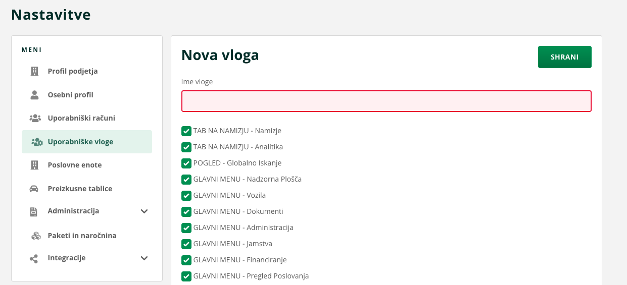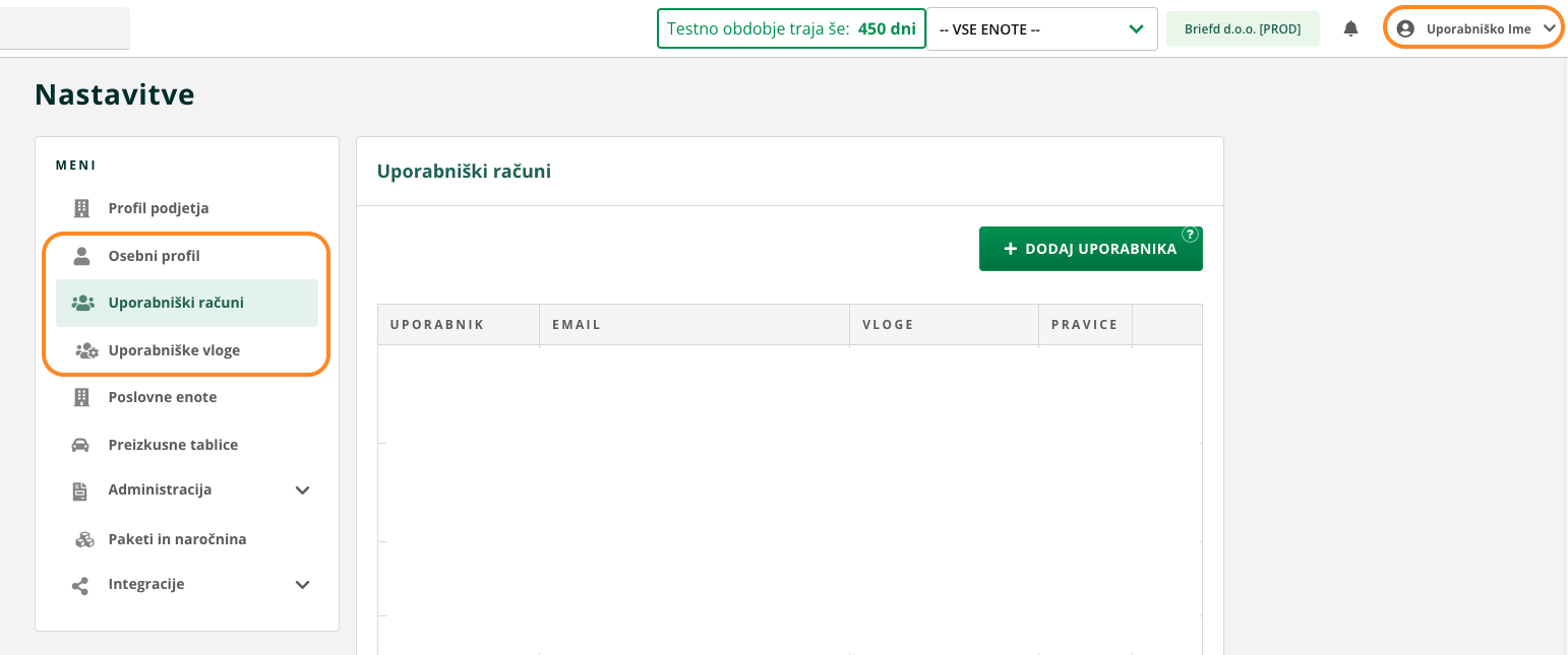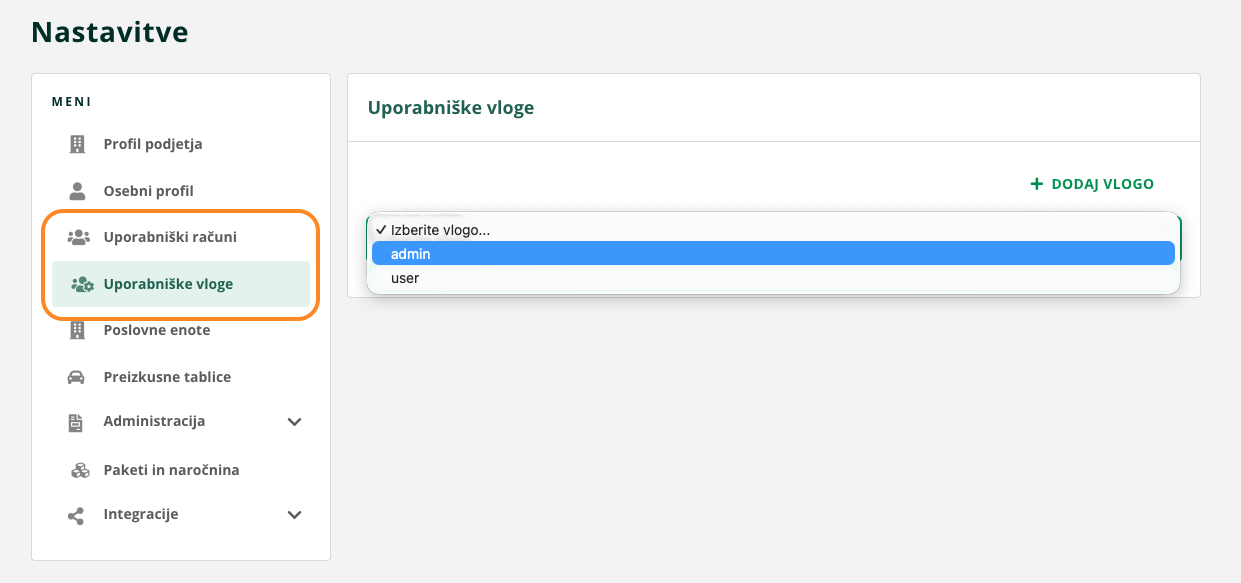 Pomembno: Če nimaš ADMIN pravic, zavihka Uporabniške vloge ali Uporabniški računi ne boš videl.