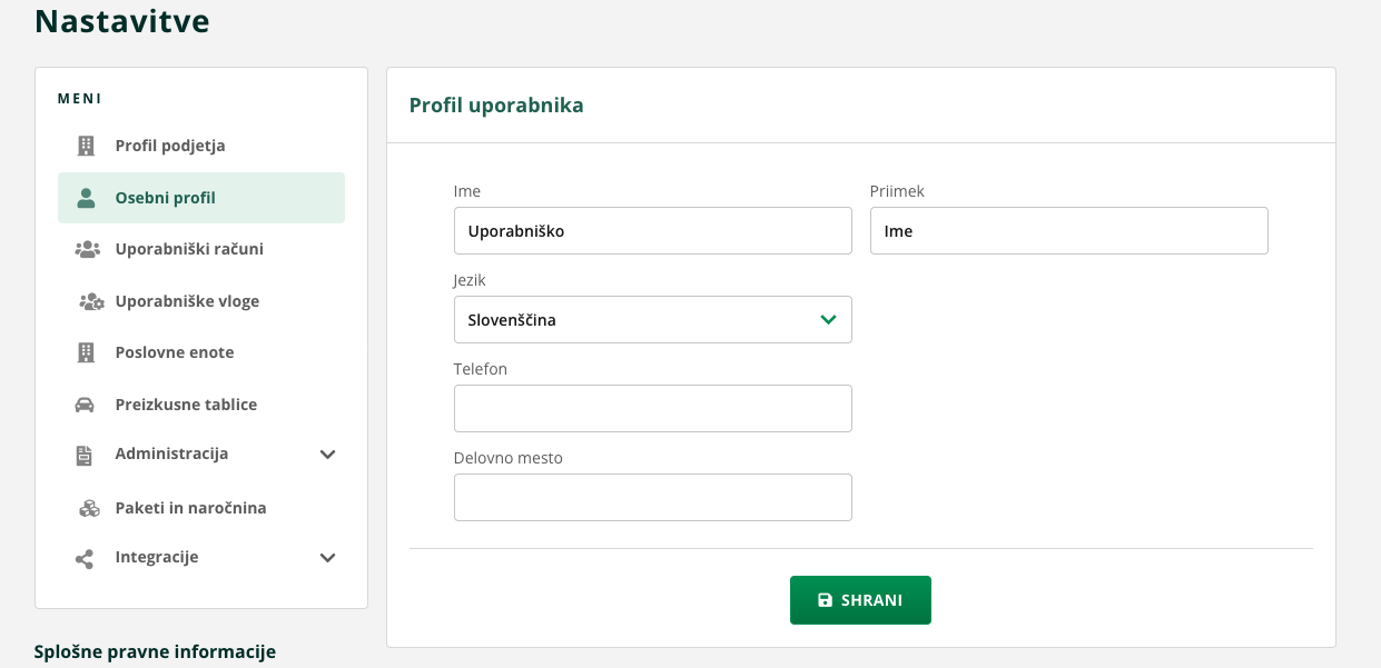 Nastavitve za urejanje osebnega profila, uporabniških računov in podjetja so dostopne v zgornjem desnem kotu platforme s klikom na svoje uporabniško ime.